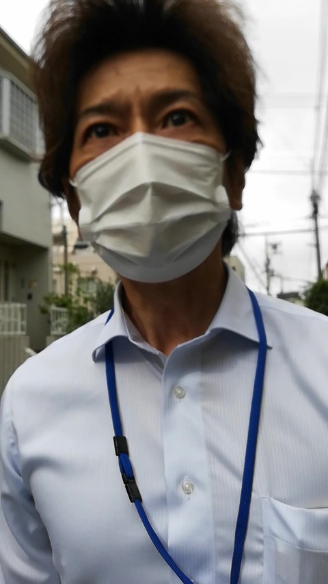 目黒区立第九中学校の高橋秀一副校長(2020年7月8日、目黒区立第九中学校近くの路上で=日本自治委員会提供)