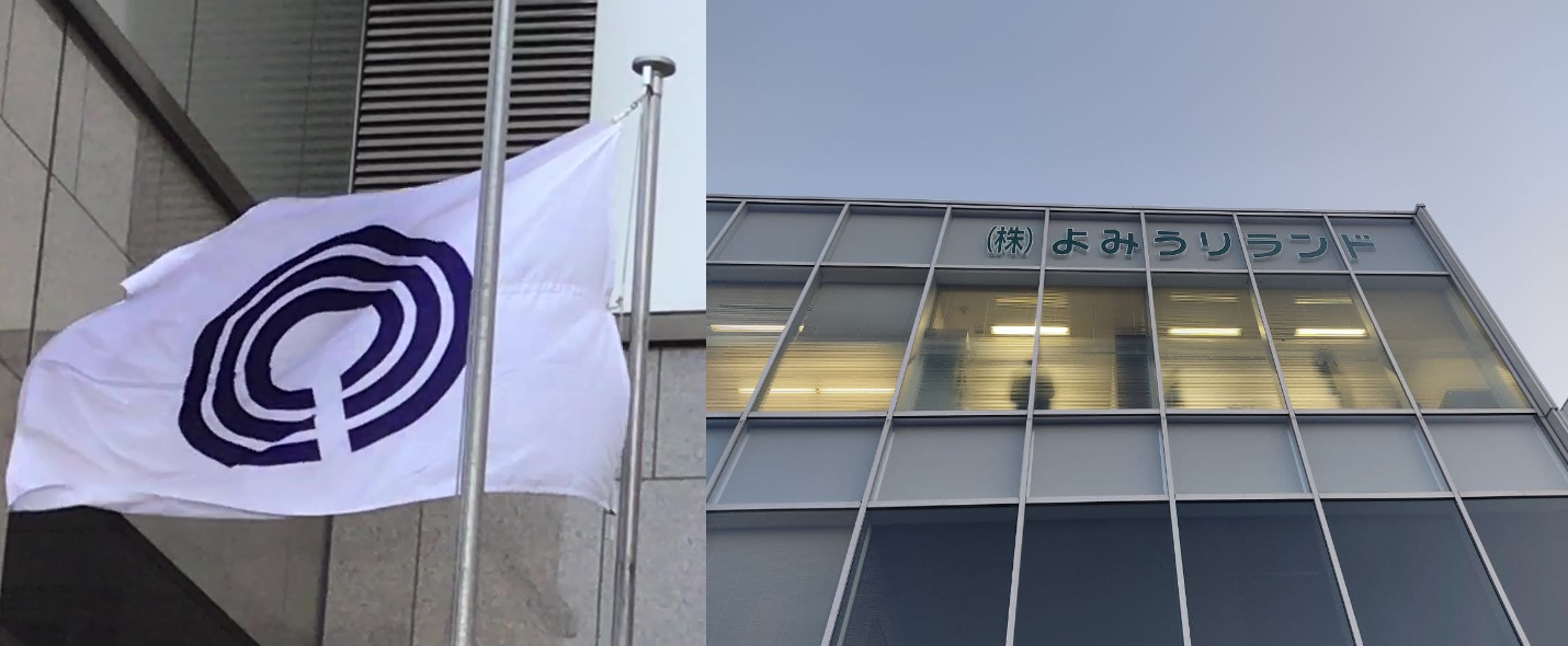 (左)川崎市役所(16日、平松けんじ撮影)、(右)よみうりランド社屋(15日、磯田航太郎撮影)