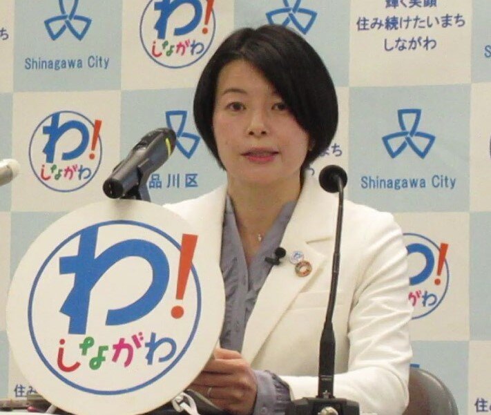 記者発表に臨む森澤恭子区長(2日、品川区役所=丸谷希唯撮影)